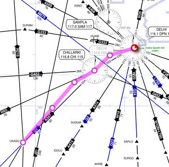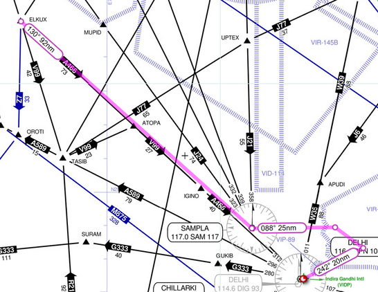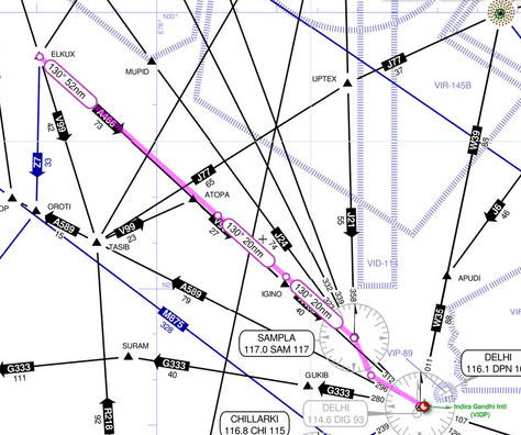 The ELKUX6(X) arrival (Formerly IGINO5(X) irl and currently IGIN5(X) in IF) procedure is primarily used by flights arriving from north Indian cities such as Amritsar, Srinagar, and Jammu, as well as from western countries like US, Canada, European nations (though not always, but, most of the time), Russia, etc.